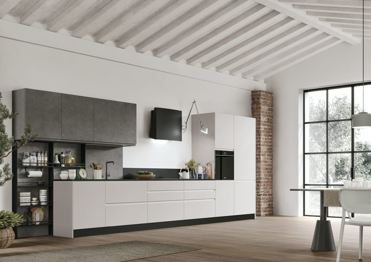 Pensata per un pubblico amante dello stile pulito e in grado di dare massimo risalto ai contrasti materici e cromatici delle finiture, Karma si distingue per l’anta con presa maniglia integrata che definisce e decora la cucina con tre tipologie di apertura: maniglia totale, maniglia parziale, contropresa maniglia, dettagli che contribuiscono a un look originale che al contempo garantisce massima funzionalità. Gli elementi caratteristici di Karma donano dinamismo alle composizioni, e garantiscono uno stile visivamente equilibrato e coerente che comprende anche intelligenti soluzioni living. Disponibile con cassetti di misure diverse (12, 24 e 36 cm), permette al progettista di giocare con alternanze di volumi e tratti netti che definiscono un design compatto.